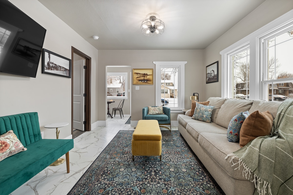 Два верхні рівні мого чотирирівневого сучасного будинку середини століття з окремими входами! Розташоване в тихому тупику біля підніжжя Блек-Гіллз і приблизно в 10 хвилинах їзди від центру Рапід-Сіті. Це помешкання має достатньо житлового простору, повністю обладнану кухню з безкоштовним сніданком, багато природного освітлення та просторий задній двір. Вона включає дві спальні та одну ванну кімнату. Я живу на повністю відокремлених нижніх рівнях помешкання, щоб ви могли насолоджуватися верхніми рівнями самостійно!