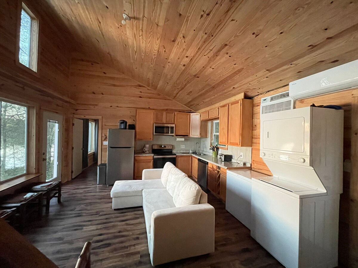 We have 3 cabins on Houston County Lake that rent separately. 1&2 have 2 rooms and 2 bathrooms with a loft. The 3rd is a Studio. Master Bedroom has a queen bed with a private bathroom. The guest room has a full-size bunk bed that can sleep 4. The loft has two twin beds in Cabin 1 and a queen mattress in Cabin 2. The kitchen has a microwave, stove, oven, refrigerator, sink, and dishwasher. We also have a Roku TV and WIFI. We have a covered Pavilion with Pickleball, basketball, and other games.