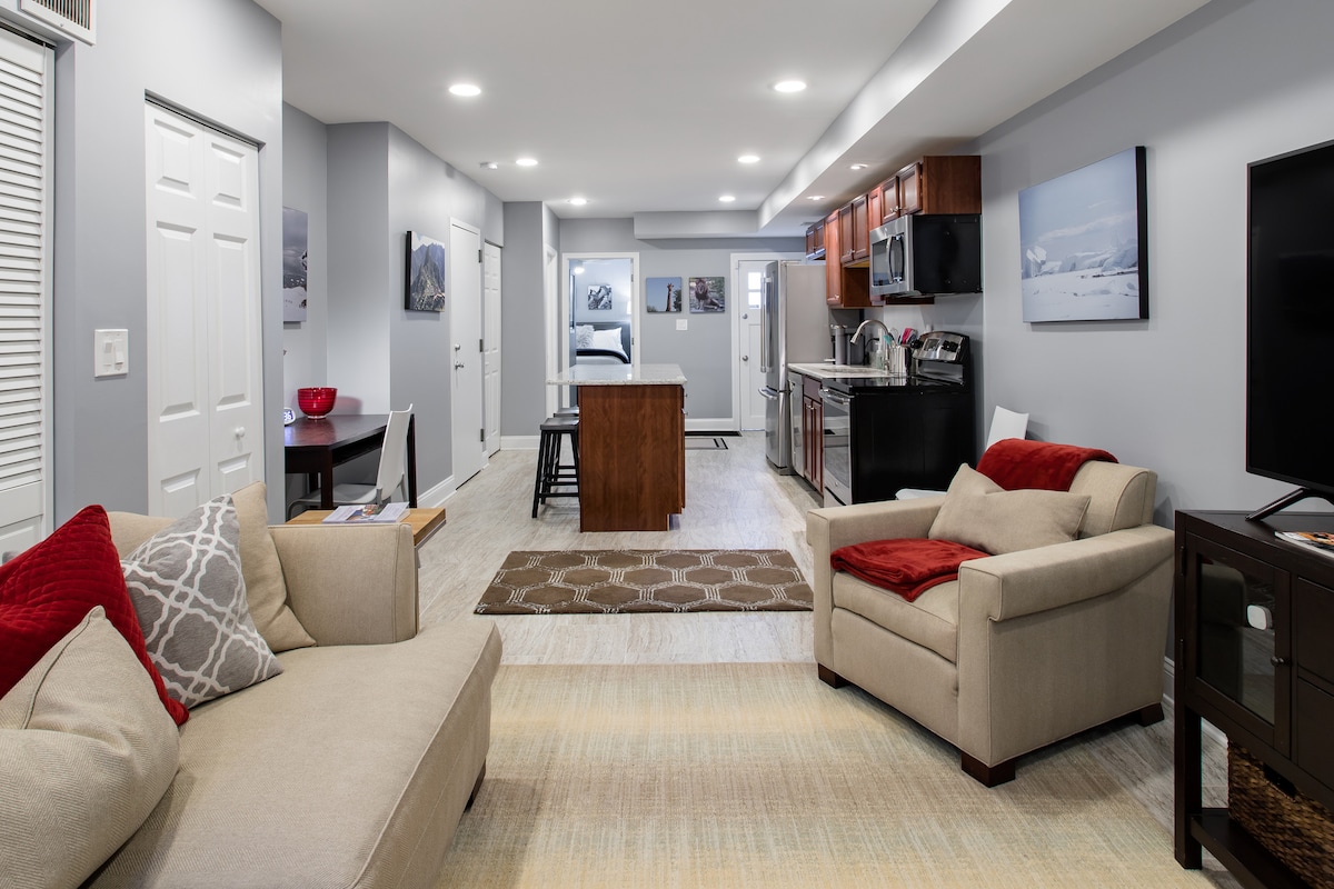 **Немає ПАРКУВАННЯ** Квартира розташована в центрі вулиці округу Колумбія з метро поблизу. Усе, що може запропонувати місто, знаходиться в пішій доступності. Гості, які перебувають тут, не подорожують автомобілем. Зверніть увагу, що в районі немає зручного громадського паркування. Це простора, сучасна квартира з 1 спальнею та 1 ванною кімнатою, розташована в центрі міського округу Колумбія. У квартирі є всі кухонні зручності, високі стелі, сучасна дизайнерська меблі та пральна/сушарка.