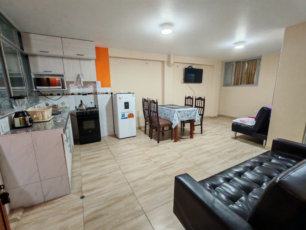 Tómate un descanso y relájate en este tranquilo y acogedor departamento, ubicado a 2 cuadras de la plaza principal, cerca de restaurantes, bancos, centros comerciales, agencias turísticas, etc. Seguro y silencioso cuenta con: TV + Paramount, cocina, frigobar, agua caliente, microondas, lavadora, etc. cochera gratuita, cómodo y seguro para usted y su familia, Cuanta con dos habitaciones, tres camas, un baño, cocina sala y todo el equipamiento necesario para una estadía placentera.