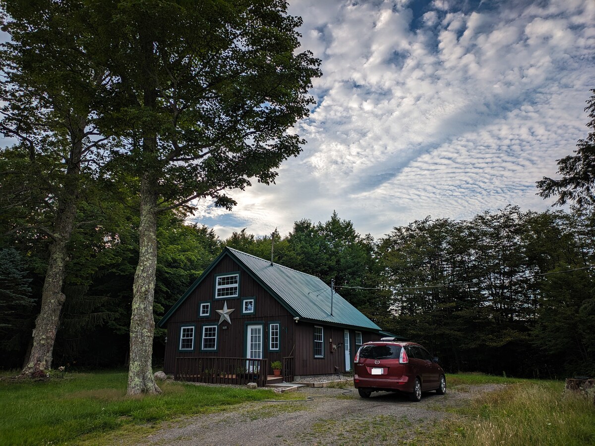 Hawkhill, ідилічний і затишний відпочинок. 2 спальні, ліжка queen-size. високошвидкісний Wi-Fi. Електричне опалення, дров 'яна піч. Насолоджуйтеся вогнем і спостерігайте за дикою природою. Місце для багаття. Газовий гриль. Доступ до під'їзної дороги протягом усього року. Повний привід найкраще взимку. Стежки до ставка, струмка й невеликого водоспаду. До Онеонти 20 хвилин. До Куперстауна 45 хвилин. Відвідайте чарівний Франклін. Дивовижна тераса другого поверху, яка виходить лише на ліс. Можна перебувати з собаками. Окремий кондиціонер в основній кімнаті в липні/серпні. Камера виходить на під 'їзну доріжку.