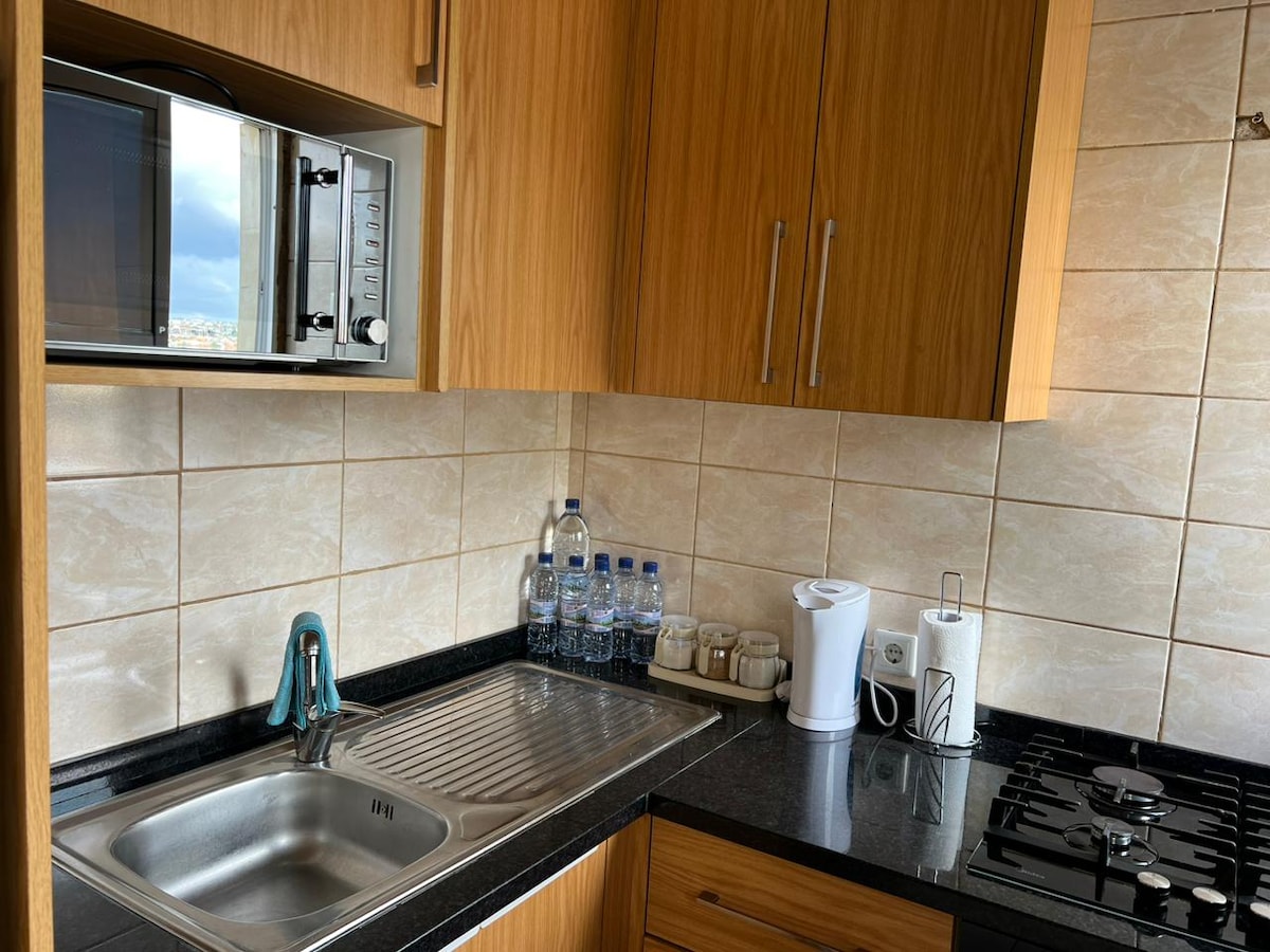 Повністю мебльована квартира, чиста, безпечна будівля, розташована в центрі міста, з сучасною кухнею, великою вітальнею, телевізором та Wi-Fi.