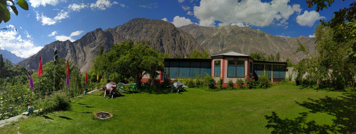 Ласкаво просимо до сімейного гостьового будинку Musofir Khona в Хуссаїні-Гояль, вашого ідеального відпочинку в центрі приголомшливої долини Хунза. Наш комфортабельний гостьовий будинок пропонує гарні номери з сучасними зручностями, смачним домашнім сніданком та персоналізованим обслуговуванням. Насолоджуйтеся захоплюючим видом на 360 Passu Cone, льодовик Хуссаїні та підвісний міст, а також сад для відпочинку. Гостьовий будинок Musofir Khona - це ваш дім далеко від дому. Забронюйте помешкання сьогодні і відчуйте тепло нашої гостинності.