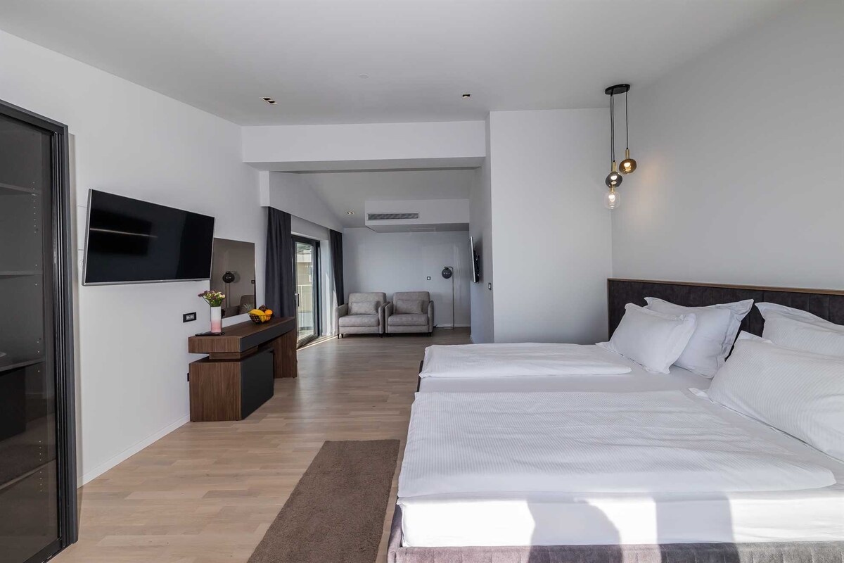 Enjoy your stay at Casa Benita Hvar, a guesthouse designed for relaxed, modern island living. Each morning, enjoy a fresh breakfast delivered to your room—INCLUDED in the price. Unwind in a cozy double bed with Netflix TV, a stylish make-up mirror and an in-room bathtub. Your private balcony with seating offers a peaceful spot to unwind with a partial view of the sea. This studio also features a fully equipped kitchen with an island, perfect for cooking during your stay.