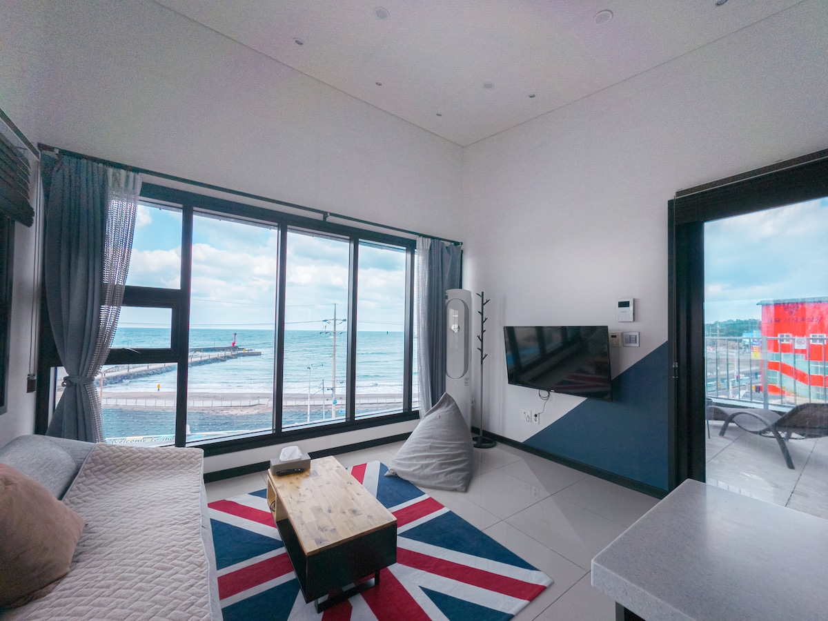 Hello. It is located on a cliff in the center of Seogwipo, so it has a perfect ocean view with permanent views. It is a one-bedroom type, but unlike other one-bedroom types of accommodations, it provides a large area, The bedroom, living room, and kitchen are completely separated, making it an efficient movement. We would like to provide breakfast in a wonderful space that boasts the best sea view along with a shared swimming pool to give you comfort and comfort on your trip to Jeju.