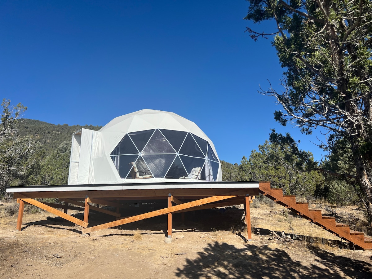 Наразі ми пропонуємо 5 геодезичних куполів і 2 відкриті кемпінги, розташовані поруч із ранчо Трейсі та східним входом до міста Рокс. Помешкання затишне, але зручно розташоване. Джуніпер і сосни забезпечують гарне покриття та усамітнення. #1 The Salty Heifer Ця затишна маленька перлина - 5-метровий купол ( 16 футів у діаметрі) з ліжком розміру «queen-size». Ідеально підходить для розміщення двох людей. У цьому помешканні може легко розміститися третій гість, просто повідомте нам, і ми зможемо встановити дитяче ліжечко.