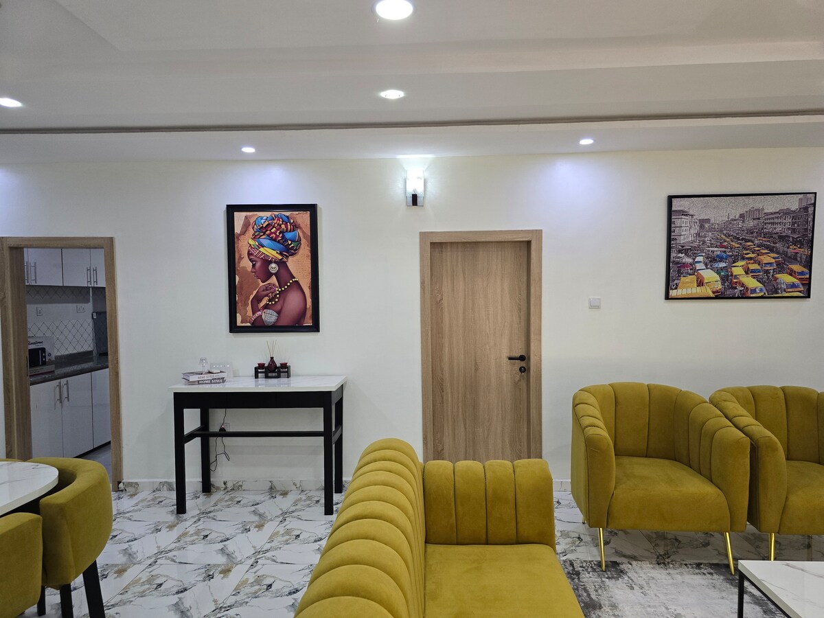 Ласкаво просимо до цієї красивої квартири з однією спальнею, розташованої на вулиці Тойін Ікея, недалеко від усього. Повністю обладнана сучасними та вишуканими зручностями, щоб запропонувати вам бездоганне проживання, ця квартира поєднує в собі елегантність та функціональність, продумано оформлена елегантними меблями, 65-дюймовим телевізором Samsung QLED та сучасними творами мистецтва, ідеально підходить для відпочинку та розваг. Просторий прихисток із зручним ліжком, повністю обладнаною кухнею з найсучаснішою технікою.