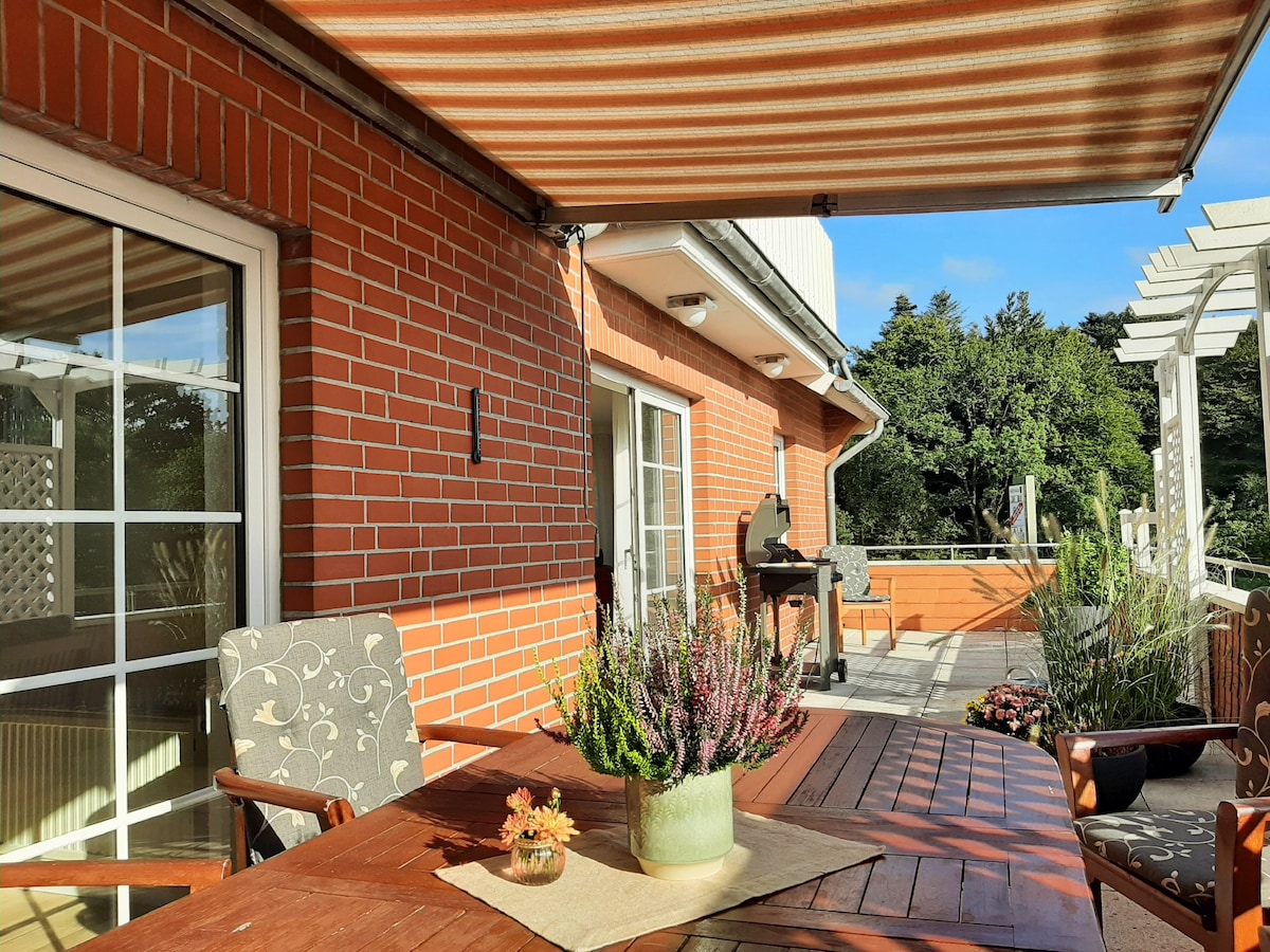 Квартира площею близько 60 м² розташована в доглянутому таунхаусі в центрі міста Оріх. До пішохідної зони, а також спортивних споруд з De Baalje або районом гавані можна дістатися за декілька хвилин ходьби. Шопінг (продуктові магазини, аптека) неподалік. Близькість до узбережжя та озера Танненхаузен ідеально підходить для одноденних подорожей. Квартира була нещодавно розширена та обладнана в 2015/2016 році.