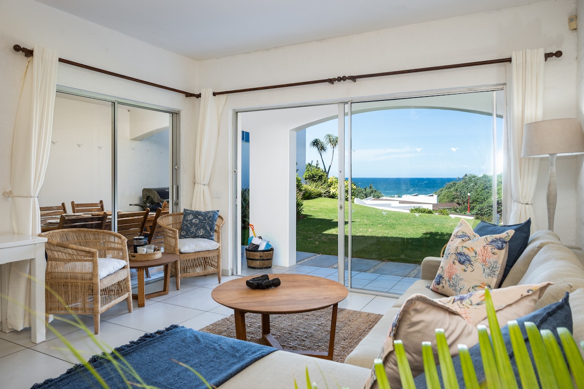 Зверніть увагу, що ДОЗВОЛЕНО ПРОЖИВАННЯ ЛИШЕ З СОБАКАМИ-ПОВОДИРАМИ З СЕРТИФІКАТОМ. Спостерігайте за дельфінами, що плавають у тихому районі Південної Африки. Безпечний комплекс, парковка, басейн із барбекю та зоною для пікніків. Красиві сади. Пральня в межах комплексу. Насолоджуйтеся заходом сонця/брааєм із дивовижним видом на море з 2 балконів із дахом. Ви можете сидіти на вулиці за будь-яких погодних умов, біля кухні, вітальні та головної спальні. Пляжі за 2 хвилини пішки через приватні ворота. Ресторани, магазини, гольф і приватна риболовля поруч.