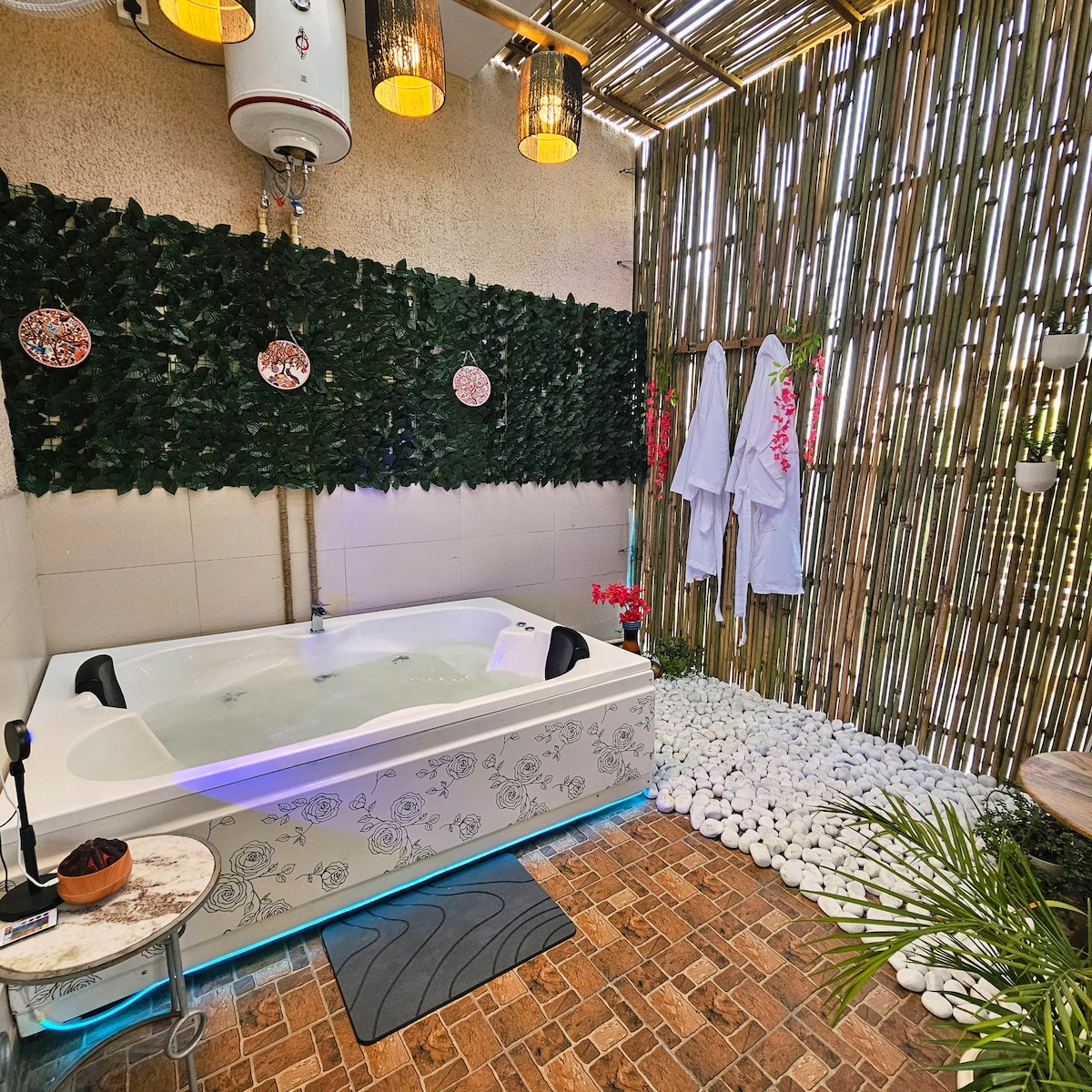 Kudarat offers a private ground-floor stay with a plunge pool attached to the bedroom, completely exclusive for your comfort and privacy. A hut-style bamboo bed above the pool creates soothing, romantic vibes, almost like floating on water. Surrounded by real plants, natural rocks, and a cozy sofa, the covered space feels calm, warm, and intimate. Designed with nature-inspired elements, Kudarat offers a safe, peaceful, home-like vibe — perfect for couples and special celebrations 😇