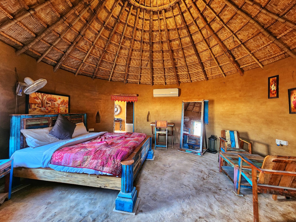 Very unique and Luxurious Mud House Cottage at Desert of Jaisalmer. This cottage is at our resort property, Which is situated 35km from Jaisalmer City to Sam Desert Road.