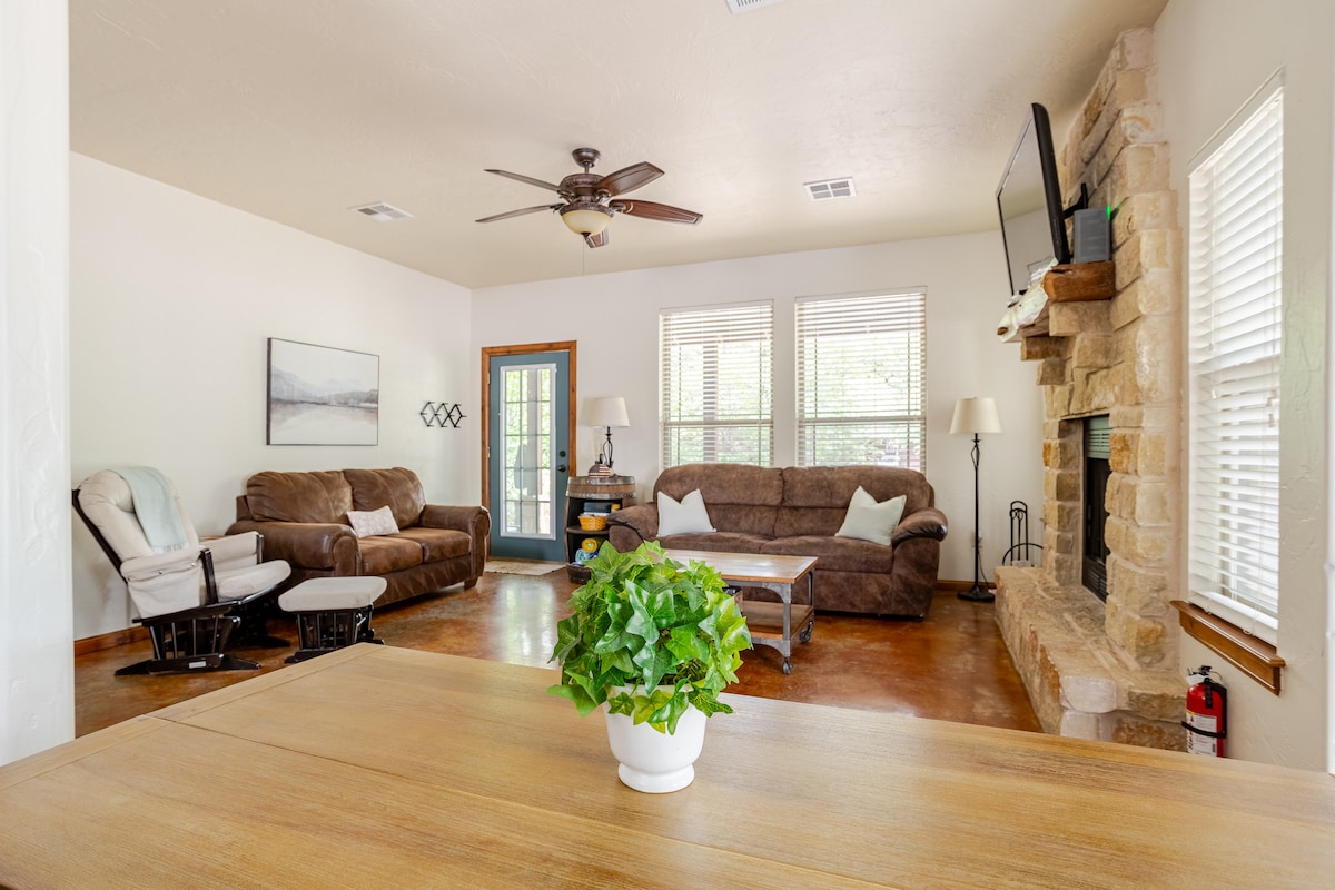 Relax with the whole family at this peaceful place to stay. Amenities include Wifi (great for streaming but not great for zoom) tv- DVD player- indoor fireplace- outdoor space (bring outdoor chairs) full kitchen w all basic kitchen needs(coffee maker, pots, pans, silverware, plates and cups, washer/dryer) and a private gate entrance. Great views and lots of wild life around house. Wichita Mtn. Wildlife Refuge and Medicine Park is a short drive away. Pets allowed- no pets on furniture.