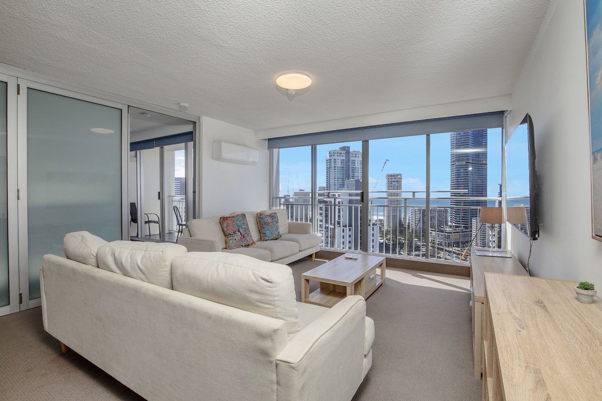 Гостюйте в центрі раю для серферів у цій сучасній квартирі на 24-му поверсі, розташованій у районі Серкл на Кавіллі, з окремого балкону, з якого відкривається дивовижний вид на океан та місто. Ви будете неподалік від пляжу, ресторанів, транспорту, магазинів та торгового центру Cavill Avenue Mall. Громадський транспорт знаходиться на порозі - сідайте на трамвай G: з 'єднайтеся з трамваєм на південь до торгового центру Pacific Fair та казино за 11 хвилин або рушайте на північ до всіх тематичних парків.
