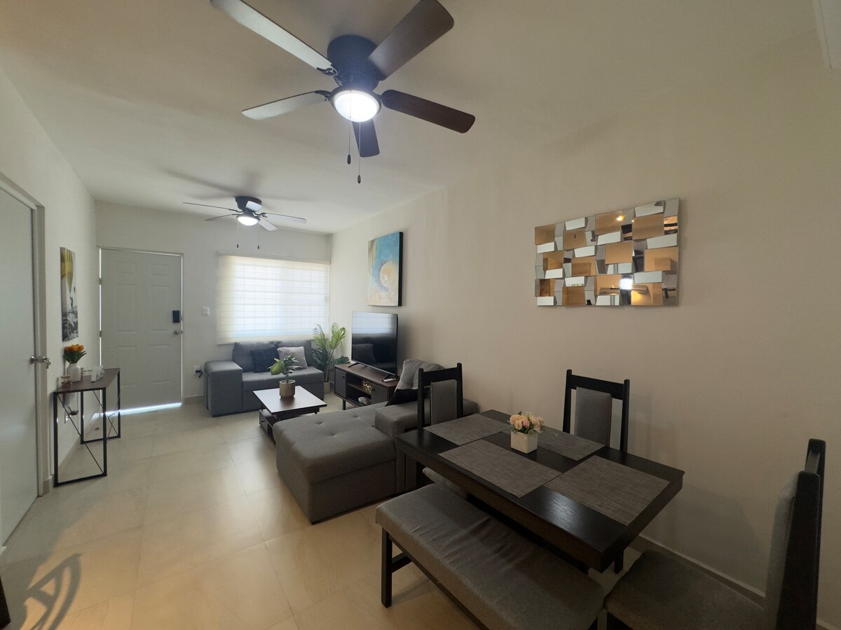 Простора та безпечна квартира в північній частині Тампіко. Він пропонує 3 спальні: головну з двоспальним ліжком та власною ванною кімнатою, а також дві спальні з двоярусними ліжками (двоспальне знизу, односпальне зверху) та додатковою ванною кімнатою. Вітальня та їдальня з кондиціонером, повністю обладнана кухня (плита, мікрохвильова піч, холодильник, кавоварка, блендер, посуд), Wi-Fi, Roku TV у кожній кімнаті, пральна машина та сушарка. Включає приватну парковку, ліфт та закритий доступ з автоматичними воротами для вашої безпеки.