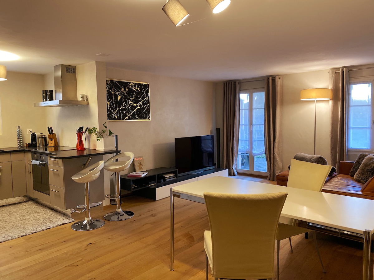 Окрема квартира з 2,5 спальнями (1 ліжко king-size, 1 ліжко queen-size і 2 односпальні ліжка), сучасна, відремонтована в старому швейцарському шале, з власними дверима доступу та садовою зоною для сидіння під старим красивим деревом. Розташована в 5 хвилинах ходьби від магазинів і в 10 хвилинах від центру Інтерлакена. Квартира мебльована та оформлена в розкішному та зручному стилі.