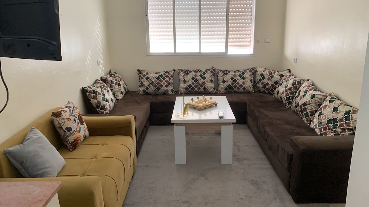 Beautiful apartment filled with natural light" in the heart of Agadir, just 10 minutes from the beach. Located on the 1st floor of a secure residence, with 2 comfortable bedrooms, a cozy living room, a fully equipped kitchen, a workspace, Wi-Fi, and IPTV. Balcony overlooking a garden—perfect for enjoying the sunrise. Less than 100m away: taxis, restaurants, currency exchange, pharmacy. Quiet and friendly neighborhood with shops and cafés open past midnight. Ideal for a peaceful stay.