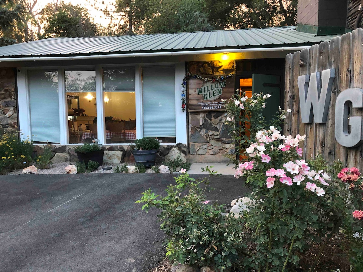 Теплий, романтичний гостьовий будинок. Знижки на Шекспірівський фестиваль. Поруч із Браянхедом, Зайоном, Брайс-Каньйоном, Колобом. Ліжко з підставкою під дерево та комод у тому ж стилі, велика ванна/душ. Затишна веранда виходить на дорослі дерева, птахів і дику природу. Насолоджуйтеся стежками та садами цього популярного місця проведення заходів. Безкоштовний континентальний сніданок. Зателефонуйте, щоб забронювати столик у Roadhouse BBQ – найкраща копчена грудинка в місті.