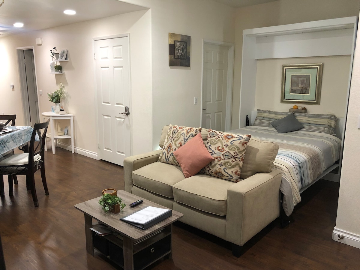 Relax in this cozy space detached from main home for a couple or up to 4. This is a one-bedroom private guest suite with a private entrance and keypad. Enjoy patio area + Gym. Located in a quiet, and peaceful neighborhood, where you will be walking distance to a park. Near Freeway 5, 105, 605, and 91 only 25 minutes away from Disneyland, 40 minutes from Universal Studios, and 20 minutes from downtown Long Beach & The Long Beach airport.