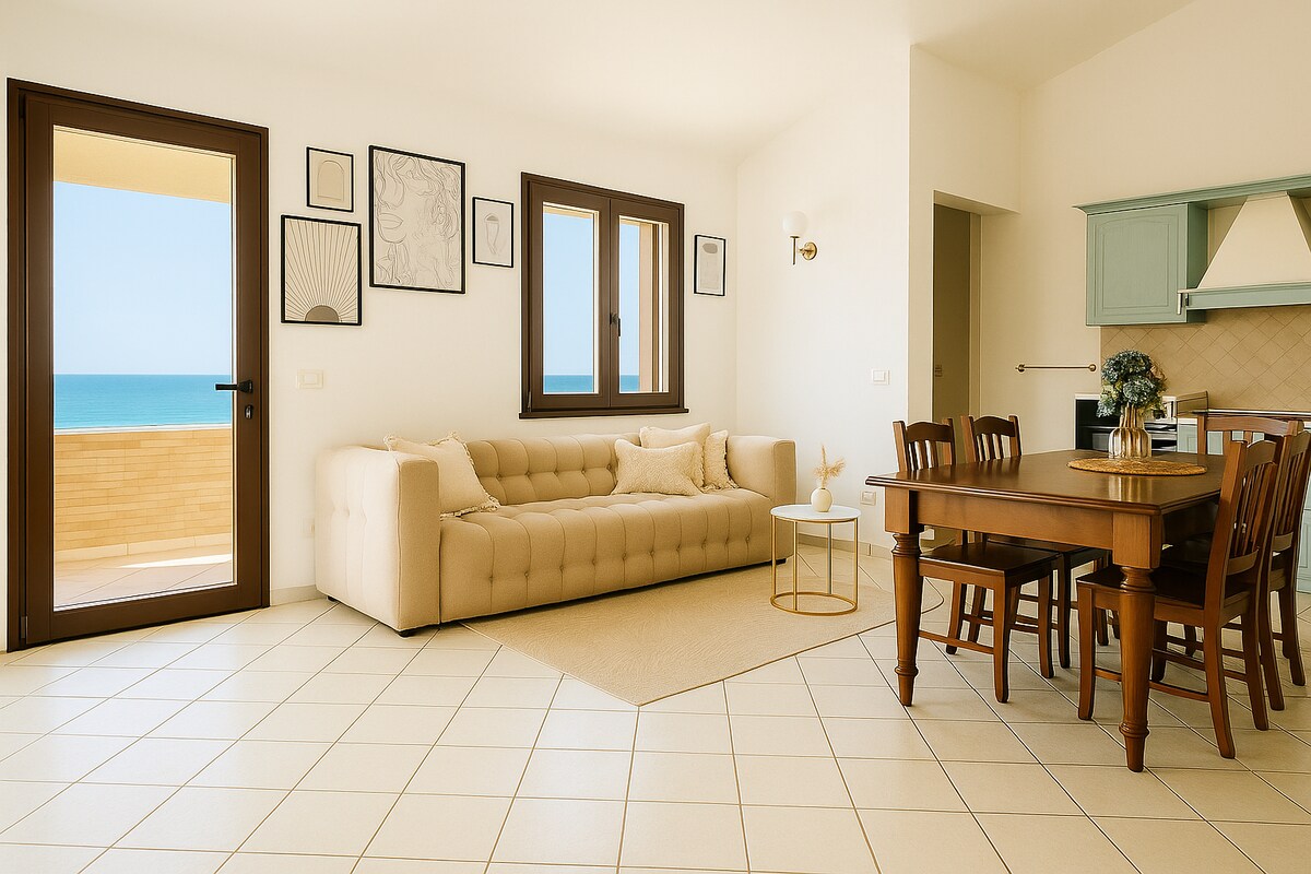 Наша квартира розташована менше ніж за 200 метрів від моря. Це квартира на першому поверсі, яка містить вітальню хорошого розміру з обідньою зоною та кухню відкритого плану, одну спальню з двоспальним ліжком, меншу спальню з банківським ліжком та ванну кімнату з душем. Квартира виграє з веранди, до якої можна дістатися з основної вітальні, з якої відкривається прекрасний вид на море та узбережжя. Прибудинкова територія обладнана обіднім столом і стільцями, і в ній є барбекю.