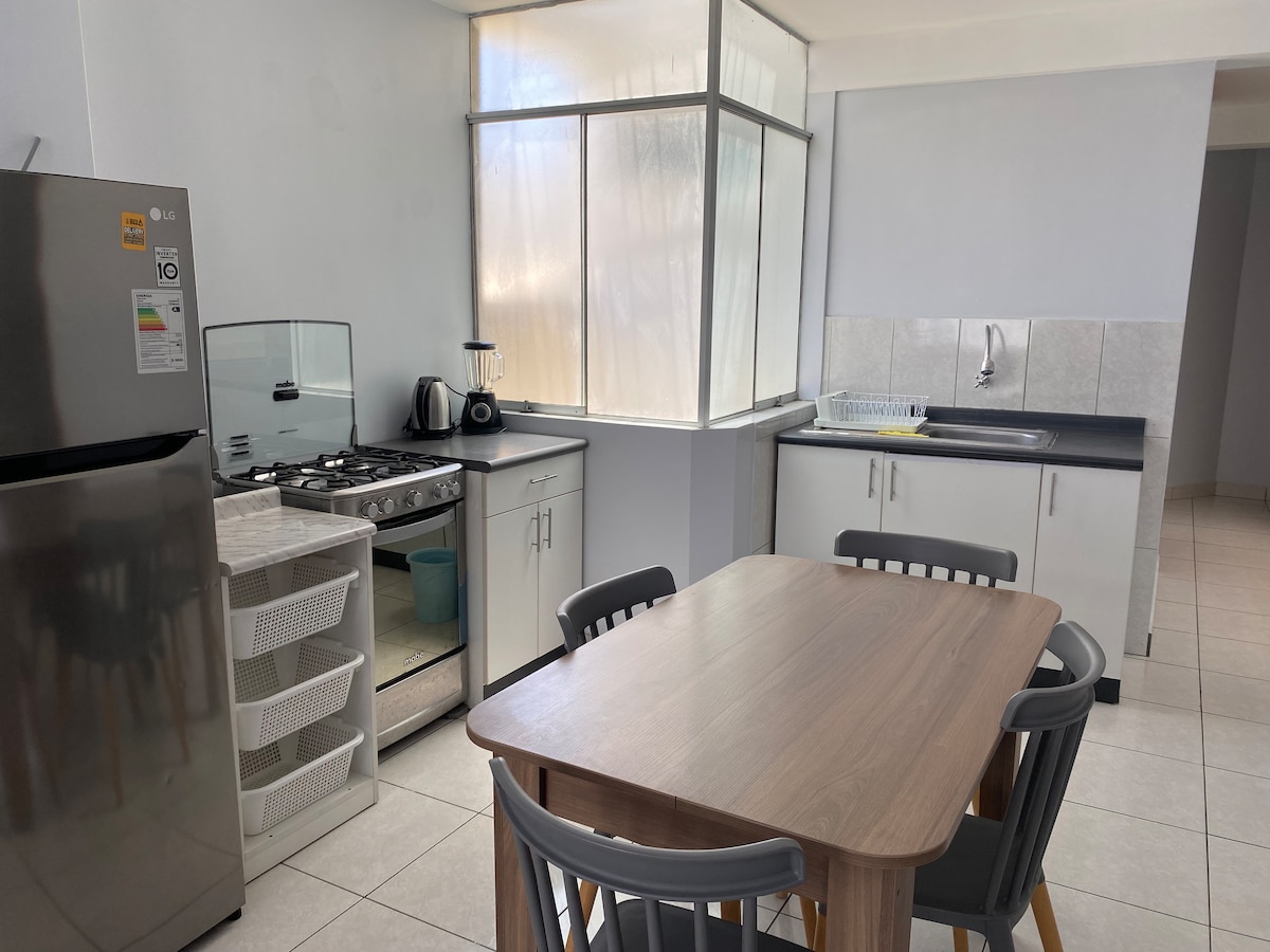 Насолоджуйтеся міні мебльованими апартаментами, розташованими на 2-му поверсі просп. Camino Real 3 квартали від центрального ринку Чімботе. 2 спальні, два ліжка та 1 ванна кімната. З електроенергією, водою, кабелем та інтернетом. Це затишне помешкання в центрі міста.