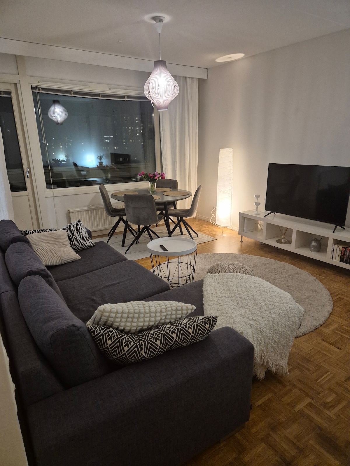 Сучасна квартира з кондиціонером площею 43,5 кв. м у вежі поруч зі станцією метро «Матінкюля» та торговим центром Iso Omena (торговий центр року 2018 року NCSC). Дивовижні види з 16-го поверху (14-й житловий поверх) з великого повністю заскленого балкона з зоною відпочинку. Центр міста Гельсінкі знаходиться лише за 20 хвилин їзди на метро. Одна спальня з двоспальним ліжком розміру king size (ширина 180 см) та модульним диваном у вітальні, що складається з 3 окремих ліжок розміром 80x200 см з механізмом легкого відкривання.