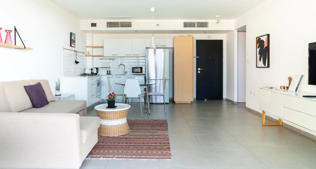 Розкішна дизайнерська квартира з приголомшливим видом на море! Ідеальне розташування — всього в 1 хвилині ходьби від пляжу та яскравої розважальної зони Marina. Квартира повністю обладнана: Сучасна кухня з технікою та посудом, холодильником і плитою, кабельне телебачення, високошвидкісний Інтернет і балкон із затишними гамаками для відпочинку. Також підходить для релігійних гостей (доступний годинник Шабат, гаряча плита та урна для води). Коротше кажучи, все необхідне для ідеального відпочинку!