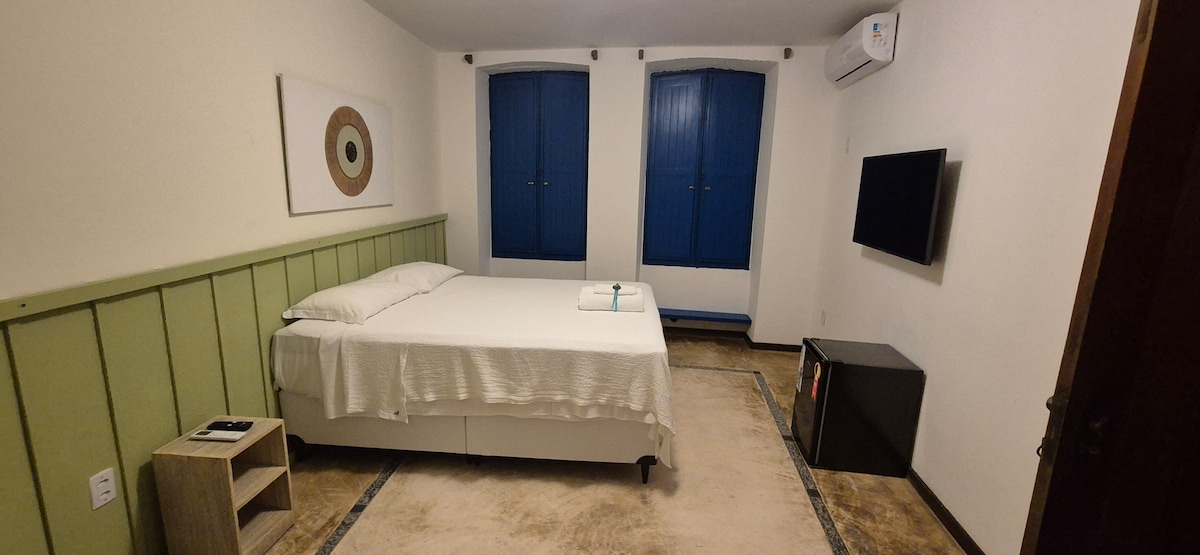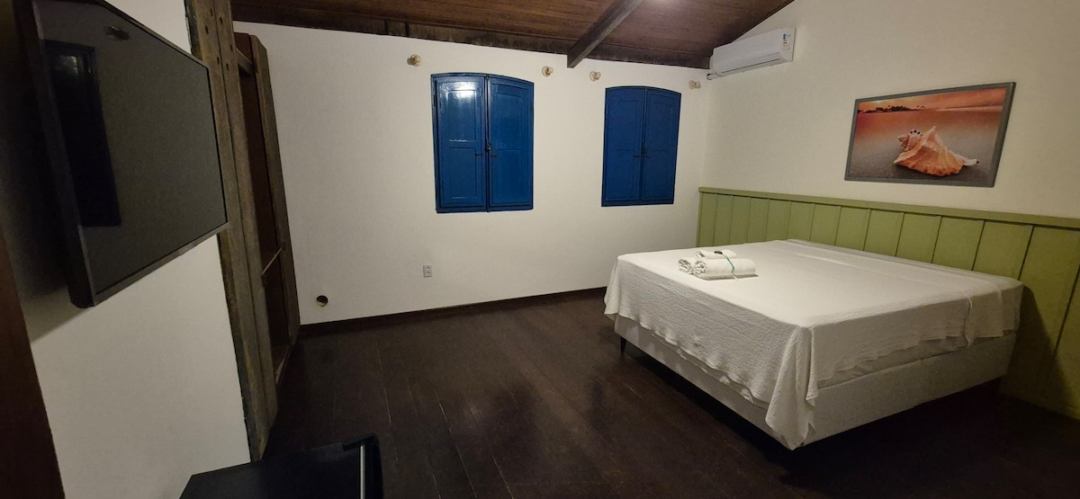 Suíte prática e confortável no centro de Itacaré, com excelente localização para quem deseja mobilidade a pé. Próxima à Pituba, à Passarela da Vila e em frente à orla. A Praia da Concha, ideal para banho, fica a cerca de 7 minutos de caminhada (500 m).