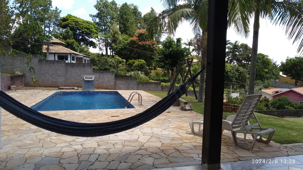 Relaxe neste espaço calmo e cheio de estilo. Terreno totalmente cercado, ideal para deixar seus pets livres. Há pássaros, esquilos, saguis, frutas, horta natural. Muita área livre e piscina estruturada de 7mil lts. Muitos espaços para conversar, redes e churrasco, fogueira . A casa é simples e cheia de charme informal. São dois quartos, uma suíte, a sala ampla, com 3 sofás, TV, internet fibra,Netflix e Amazon. Estamos na Rota das Frutas, ao lado do DODA TRAINING , escola de equitação.