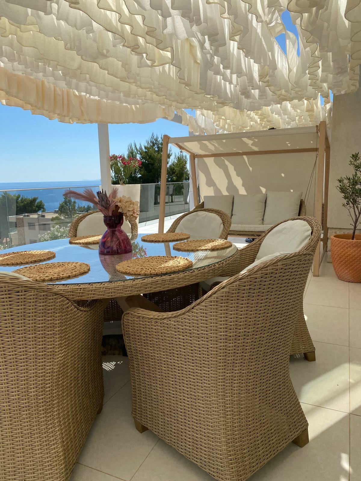 Квартира площею 60 м 2 складається з спальні з великим двоспальним ліжком, ванної кімнати, просторої вітальні з кухнею, коридору та балкону. Вся південна стіна, обрана до моря, скляна, тому простір має багато світла і робить один простір з балконом. Квартира розташована на третьому поверсі будинку, який розташований біля центру міста (5 хвилин приємної прогулянки біля моря) і з балкону має відкритий вид на море та острови, оскільки будинок розташований в першому ряду біля моря.