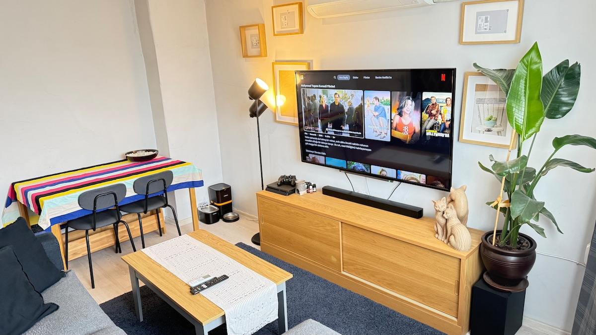 65-дюймовий Philips Ambilight OLED Smart TV Аудіосистема Wi-Fi гаряча вода на весь час 6-й поверх (є ліфт) спокійний будинок. Ви будете почуватися як вдома. ви також можете користуватися домашнім кінотеатром є Digiturk (beIN) для всіх футбольних ліонів і серіалів, фільмів. Gece-Gündüz canlı ve güvenli bölge. Банкомати, спеціально прикрашені архітектором, знаходяться в 5 хвилинах ходьби. Вид на море та парк. Пірс Конак і вежа з годинником. А транспорт займе 2 хвилини на автобусі, що проїжджає через двері.