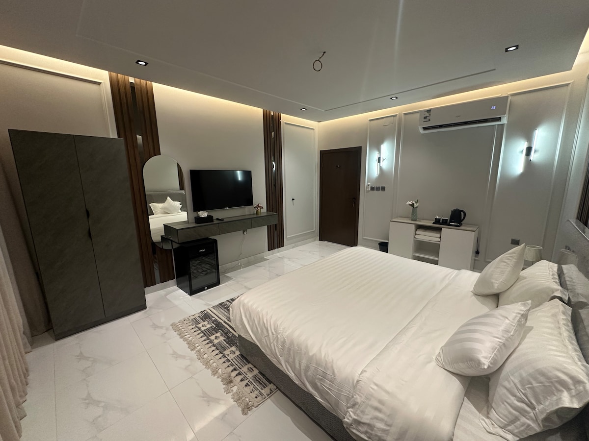 Розкішний готельний✔️ люкс, який вирізняється якістю, вишуканістю та розкішшю в найдрібніших деталях меблів та центральної системи кондиціонування. ✔️ Відрізняється близькістю до залізничного вокзалу, який знаходиться всього в 5 хвилинах їзди (Усередині станції є автобуси, які забезпечують пряме сполучення з Меккою) Апартаменти ✔️ мають одну комфортабельну спальню та велику та розкішну вітальню з великим телевізором. Апартаменти ✔️ розташовані в найпрестижніших районах Мекки, за 10 хвилин від Заповедника Мекки, і поблизу є багато послуг і виняткових ресторанів.