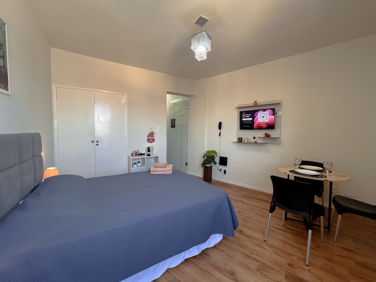 Затишна квартира з однією спальнею, вітальнею та кухнею, на 20-му поверсі, з усіма зручностями, для бізнесу, навчання або відпочинку; з Wi-Fi, кабельним телебаченням та DVD-плеєром; басейн, сауна, тренажерний зал та кімната для вечірок на даху; конференц-зал; цілодобова стійка реєстрації; платна парковка в підвалі; пральня з жетонами. Розташоване поруч із лікарнею Vera Cruz, в 5 хвилинах від автовокзалу, Муніципального ринку та головних торгових вулиць; в 15 хвилинах від Віракопоса.