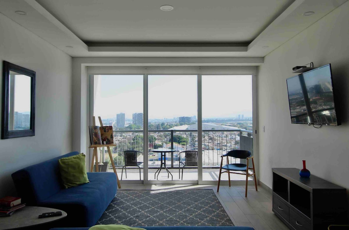Нова розкішна квартира на 9-му поверсі з захоплюючим видом у повністю мебльованій реальній зоні, призначена для ділових або сімейних поїздок, самостійне паркування безкоштовно, 2 ліфти, басейн, джакузі, тераса, зони відпочинку, ігрова кімната, цілодобова приватна охорона, бігова доріжка. Прямий доступ до торгового центру «Real Center» з ресторанами, барами, кінотеатрами, боулінговими алеями, банками, Sam's тощо. Швидкі комунікаційні маршрути. У 5 хвилинах їзди Усе, що ви чудово провели час.