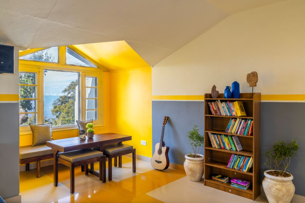 This dorm is styled with mosaic wall art on an otherwise white interior. A bed here comes with a locker, an ensuite shared washroom, and a balcony with a mountain view. Engulfed by the tall snow-covered and rolling green peaks on all sides, the 2-storeyed brick-covered Zostel Pahalgam is your retreat into the proverbial winter wonderland. As you make your way to the entrance through a lamp-lit pathway, a colourful seating in the garden and a lantern-ridden tree in the middle greet you.