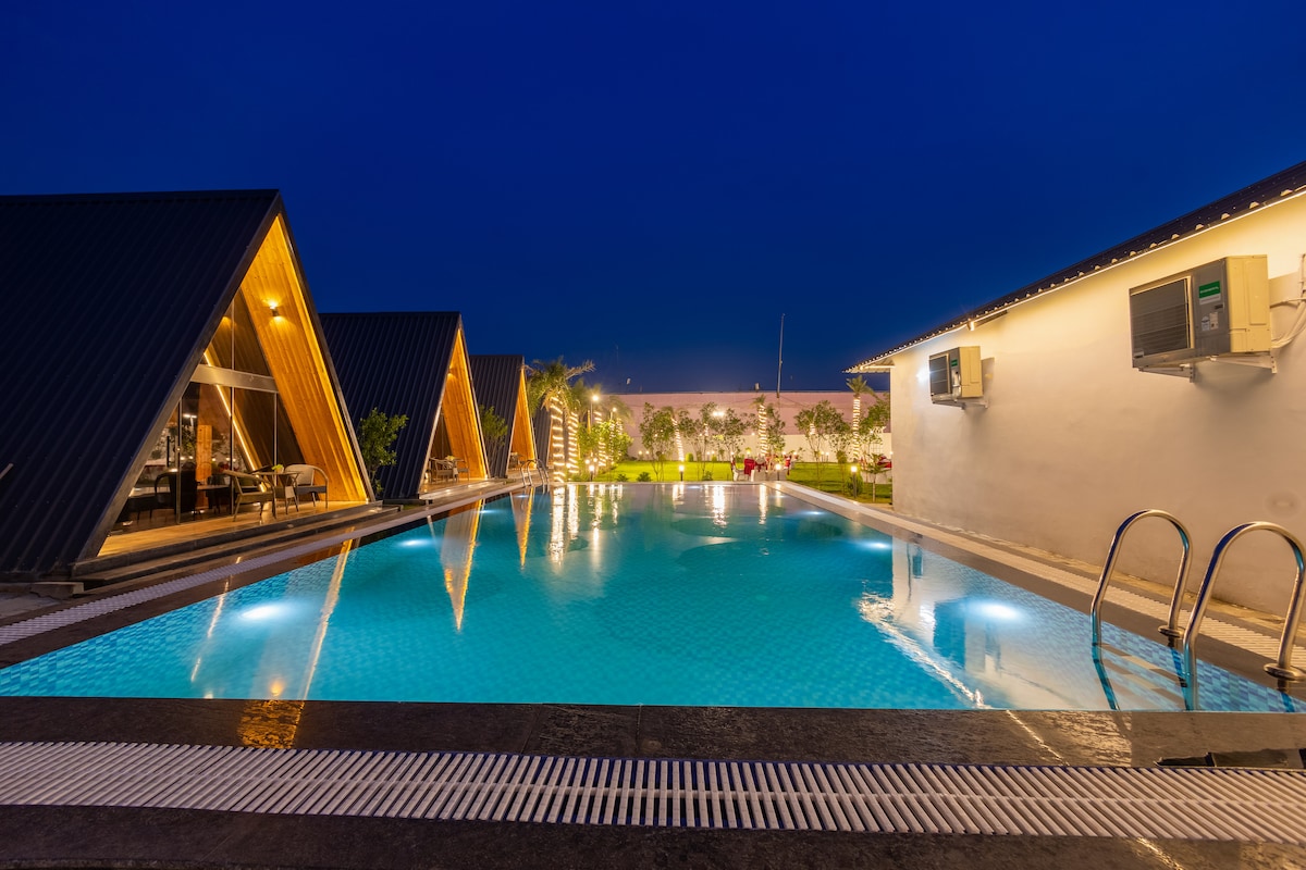 ◆The sparkling pool, framed by open skies and swaying trees, sets the tone for this peaceful 5-BHK farmhouse. ◆Every moment here flows gently, embracing an unhurried pace of life. ◆The private swimming pool is the highlight—shimmering under the open sky like a tranquil oasis. ◆Mornings begin with a refreshing dip in its cool, calm waters. ◆Afternoons invite you to relax on sun-kissed loungers by the poolside. ◆As night falls, the pool glows under the stars, creating a truly magical setting.