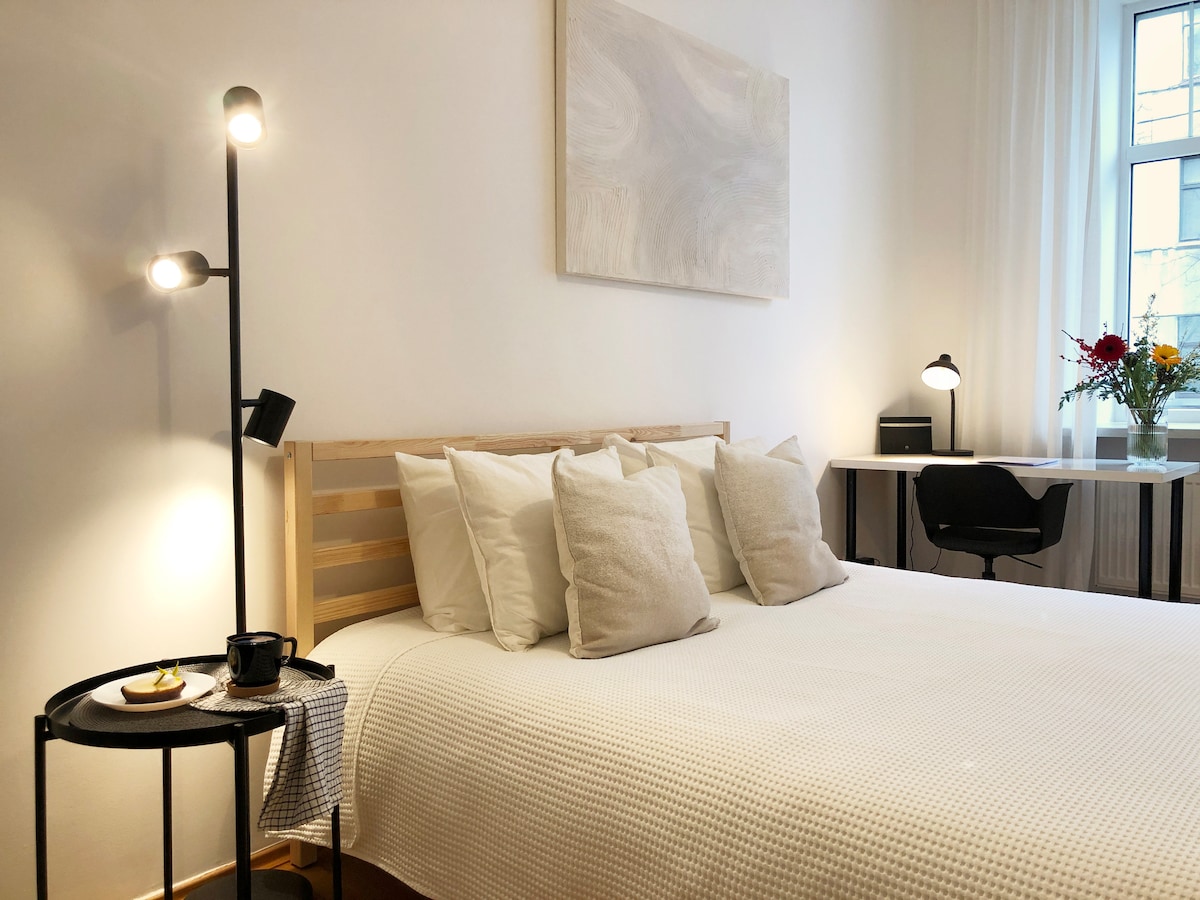 Відчиніть дерев 'яні двері в історичну будівлю, щоб знайти світлий, просторий будинок із рослинами та сучасними творами мистецтва. Скандійські меблі та блискуча біла палітра доповнюють паркетну підлогу з ялинки та вишукану стельову троянду. Комфортна квартира в жвавому центральному районі з високоякісною фурнітурою та всіма зручностями, які може сподобатися сучасному мандрівнику.