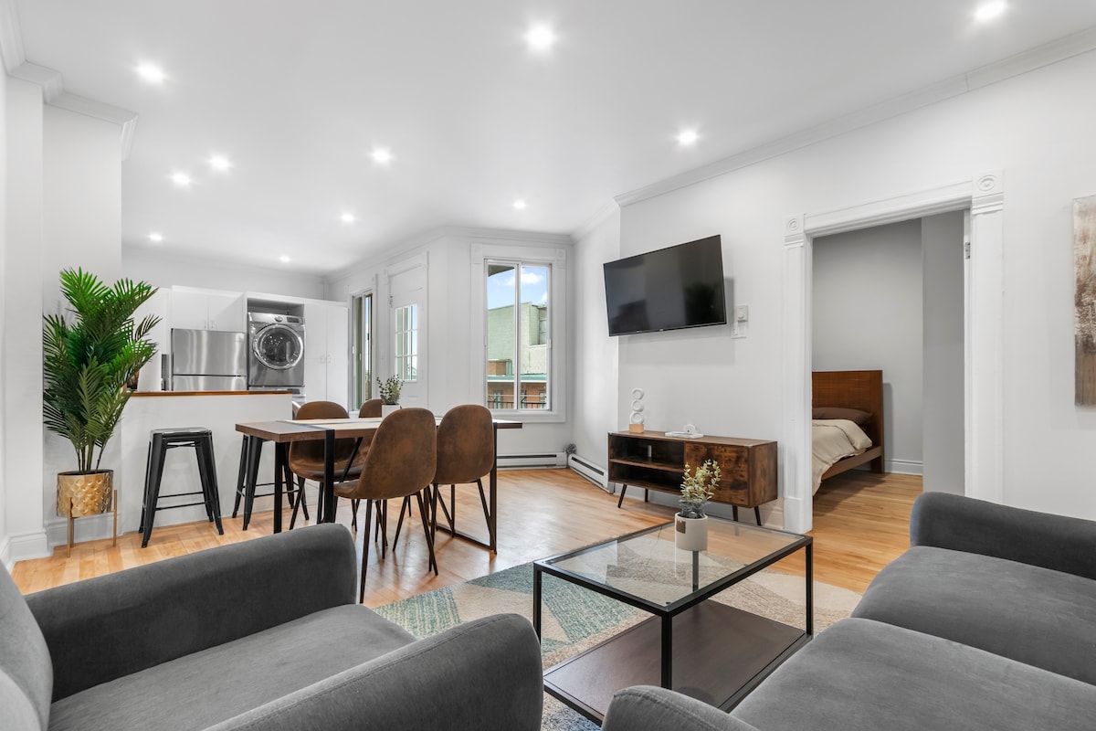 Уявіть компактну, бездоганно утримувану студію, розташовану в центрі Монреаля. Його простота - це його шарм: незаймані білі стіни створюють полотно для сяйва індивідуальності кімнати. Розумні рішення для зберігання речей забирають речі, забезпечуючи ефективне використання кожного сантиметра. Унікальні штрихи додають характеру та тепла помешканню. Завдяки своїй чистоті, продуманому дизайну та індивідуальному колориту ця студія пропонує прихисток спокою серед міської метушні та метушні.