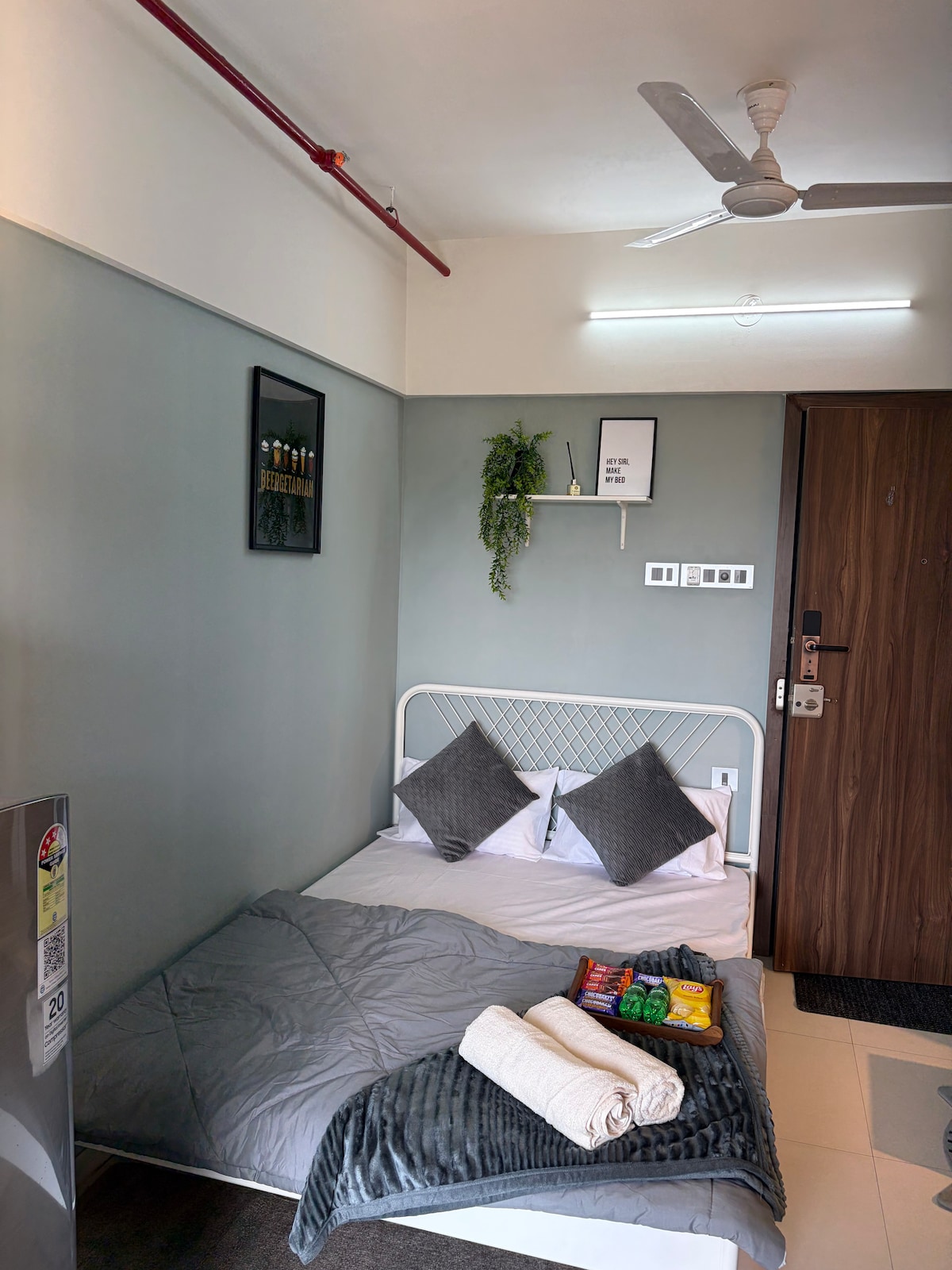 •Comfortable Living Space: Modern decor with a plush queen-size bed, a sofa, and a dining nook. •Fully Equipped Kitchen: Perfect for cooking meals or enjoying a morning coffee. •Amenities: High-speed Wi-Fi, a flat-screen TV, and AC •Prime Location: Close to public transport, shopping, and vibrant nightlife. Whether you’re exploring Pune’s attractions, savoring the local cuisine, or just unwinding, this studio has everything you need for a memorable stay. Book now for your perfect getaway!