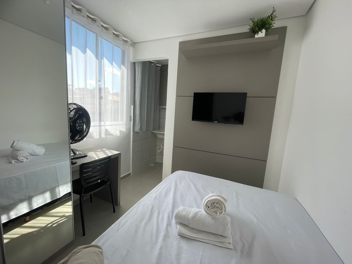 Curta uma experiência elegante na zona Nobre de JM. Apartamento studio bem confortável e estruturado, próximos a restaurantes, bares, lanchonetes. Contém todos os aparatos como, vasilhame e enxoval ( microondas, cafeteira, misteira, frigobar, ferro a vapor, secador de cabelo, fogão de indução, panelas, pratos, talheres, toalhas e lençóis). Conta ainda com academia, Coworking, Rooftop, lavanderia , minimercado, estacionamento ( vagas presas e limitadas,de acordo com a disponibilidade.