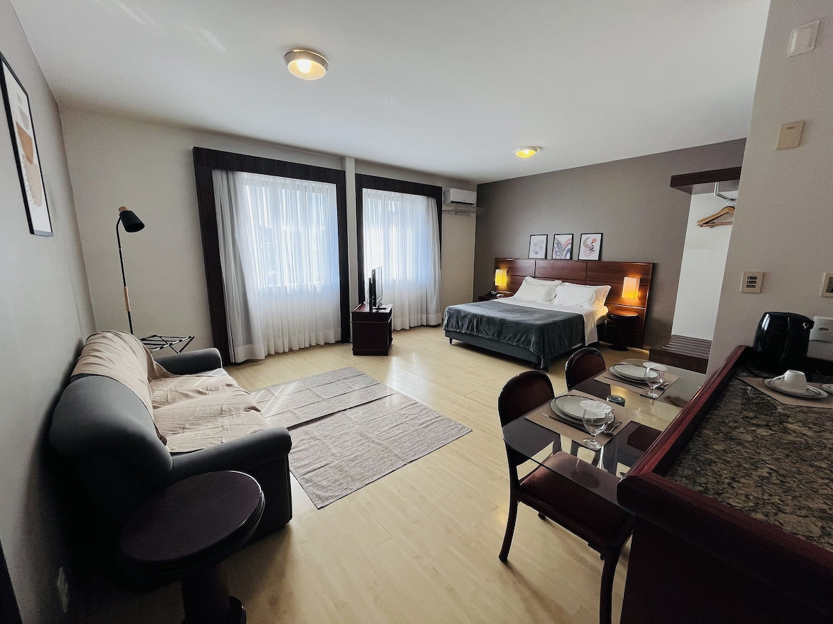 Localizado na melhor região da cidade, esta elegante suite combina sofisticação, conforto e praticidade. O espaço é finamente decorado, com ambiente integrado, cama aconchegante, TV Smart, ar-condicionado. Ideal para casais ou viajantes a lazer, oferece fácil acesso aos principais pontos turísticos, restaurantes e comércios. Perfeito para quem busca uma estadia charmosa e conveniente no coração da cidade.