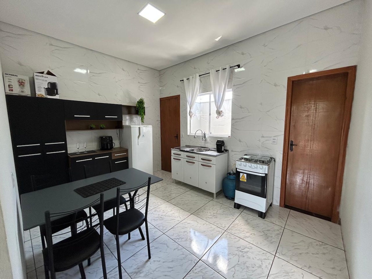 Kitnet mobiliada com garagem, localizado na avenida Londrina, próximo ao redondo do módulo 05. Possui 4 camas, sendo duas de casal e 2 de solteiro, fogão, geladeira, máquina de lavar roupas, chuveiro elétrico, cozinha... Em um dos quartos tem Ar condicionado e no outro ventilador.