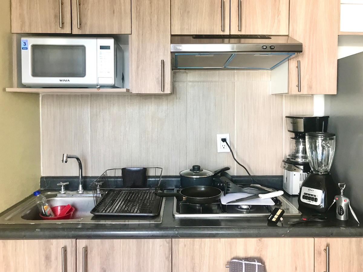 Квартира розрахована на 4 осіб. У ньому є повністю обладнана кухня, невелика, але гарна ванна кімната та одна спальня з двома поверхами. У спальні є два односпальні ліжка внизу та ліжко queen-size нагорі (без додаткових дверей; це лофт) із власною шафою. Кухня повністю обладнана плитою, холодильником, каструлями, тостером, бойлером, кавоваркою, столовими приборами, посудом, а також деякими предметами першої необхідності для приготування їжі, такими як кава, чай, олія, сіль і перець.