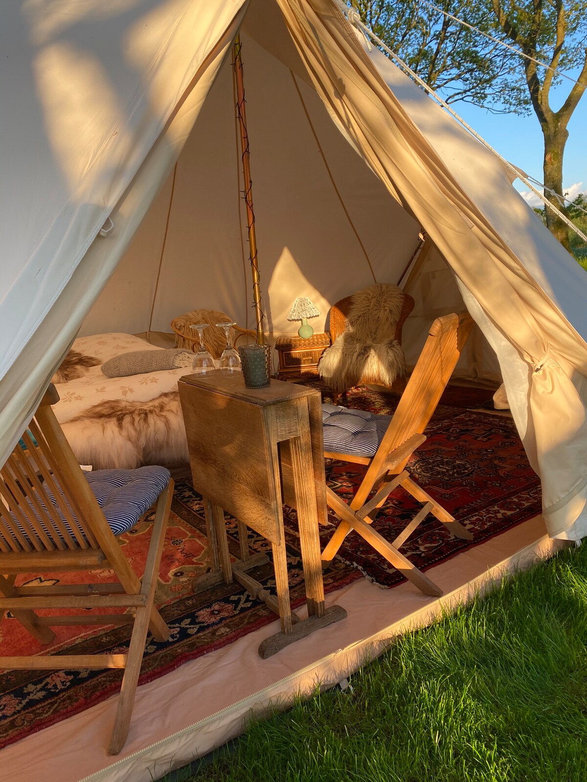 Намет для глемпінгу з видом на луг і невеликий садовий ставок