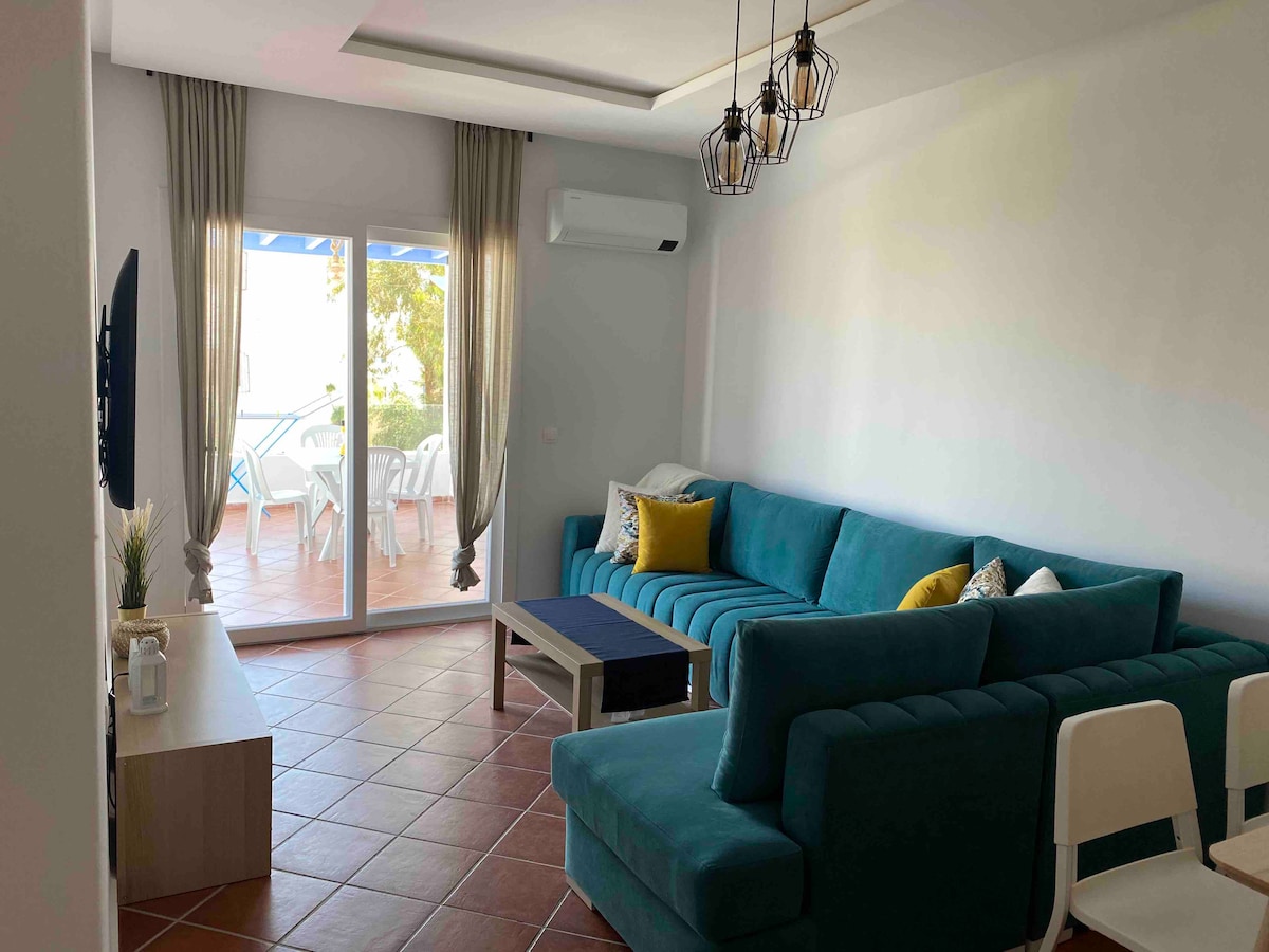 Appartement de plage possédant deux chambres, un grand salon et une large terrasse avec une superbe vue sur la plage de Cabo Negro. L'appartement peut accueillir cinq personnes. Il se situe dans une résidence calme et sécurisée située sur le flanc de montagne. La plage est à deux minutes à pieds et la montagne offre plusieurs sentiers pour de longues balades. Vous disposerez également d'une place de parking. PS: Nous requérons des voyageurs une copie de leur pièce d'identité pour chaque visite.