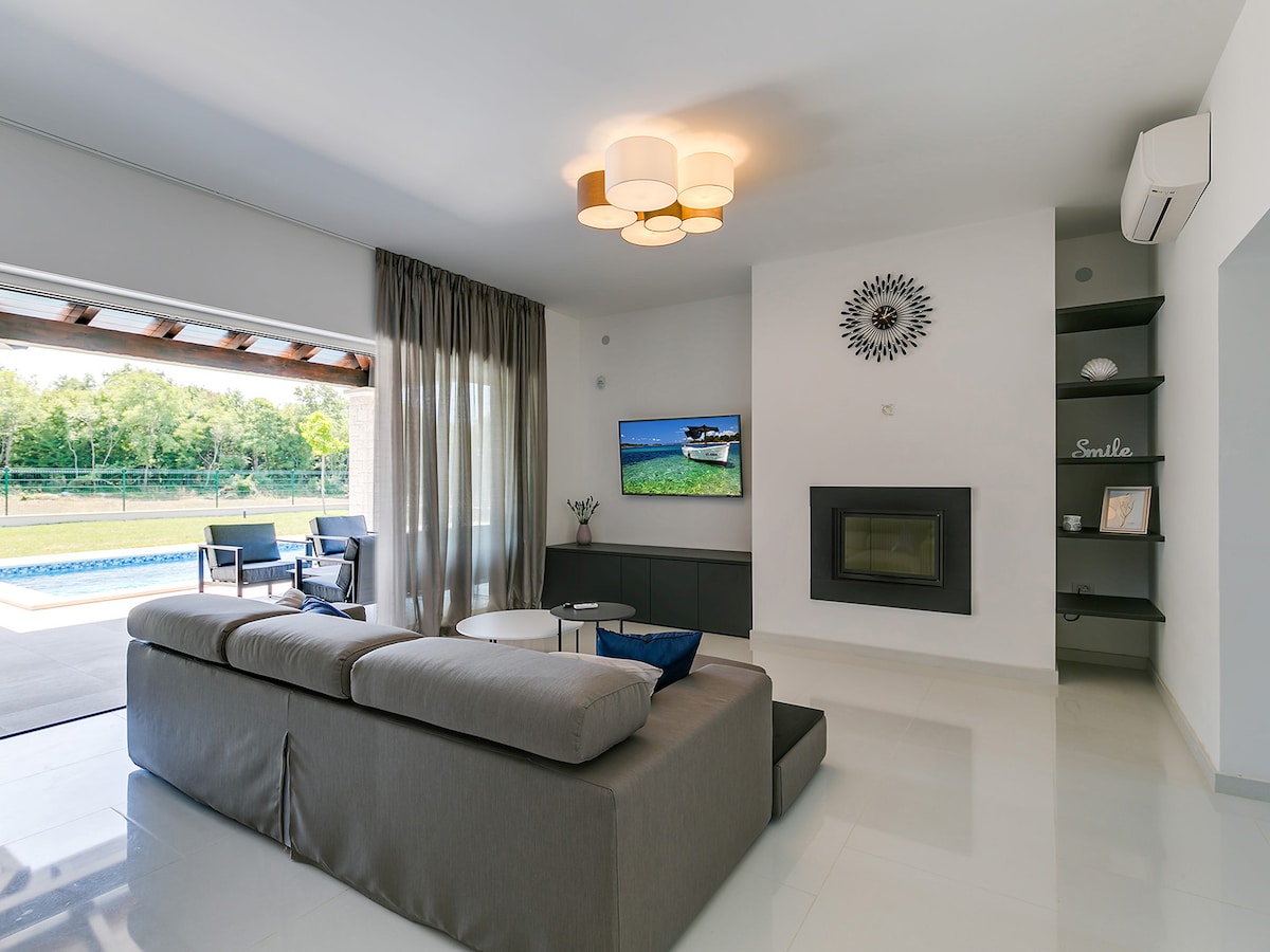 Стильна вілла біля Ровіня з мальовничим басейном, гідромасажною ванною, сауною. Прокиньтеся з панорамним видом на долину. Підходить для пар і сімей, недалеко від парку пригод, Національного парку Бріюні, динопаку, середньовічних міст і місцевої кухні. Це справжня зелена втеча для тих, хто хоче повернутися до природи з усім комфортом сучасного життя. Повністю обладнаний для приготування їжі та розваг у саду площею 2600 кв. м (футбол, швидкісний м 'яч, бадмінтон і басейн) для ваших дітей і близьких.