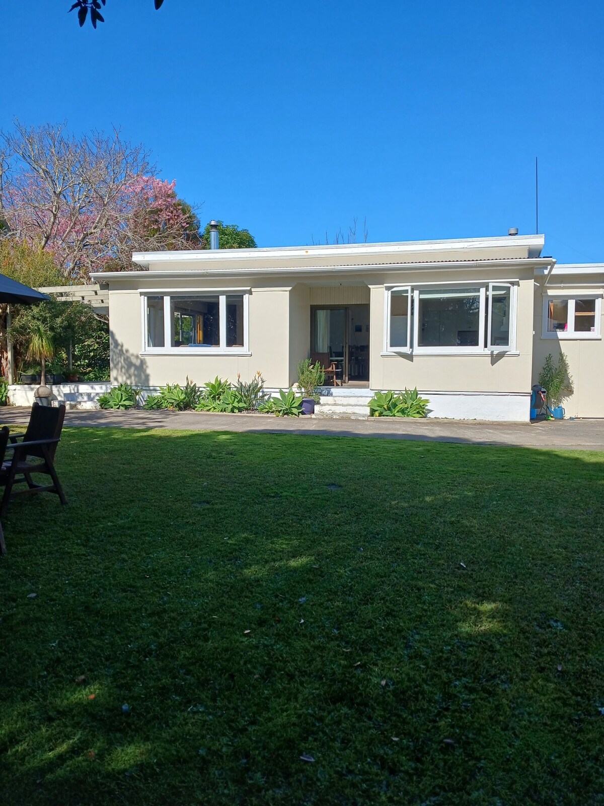 Для груп із понад 4 дорослих натисніть «Зв 'язатися з господарем», щоб спочатку звернутися до нас. Цей сучасний сонячний пляжний будинок має просторі краєвиди на пляж Лангс і Вангарей-Хедс, чудово обрамлений великими похутакавами. Велика вітальня відкритої плани з двоспальними та критими терасами забезпечує чудовий внутрішній/зовнішній потік і доступ до краєвидів, де б ви не сиділи. Для сидінь переднього ряду крісла на відкритому повітрі є чудовим місцем для ранкової кави або напоїв наприкінці дня. Постільна білизна включена в тарифи