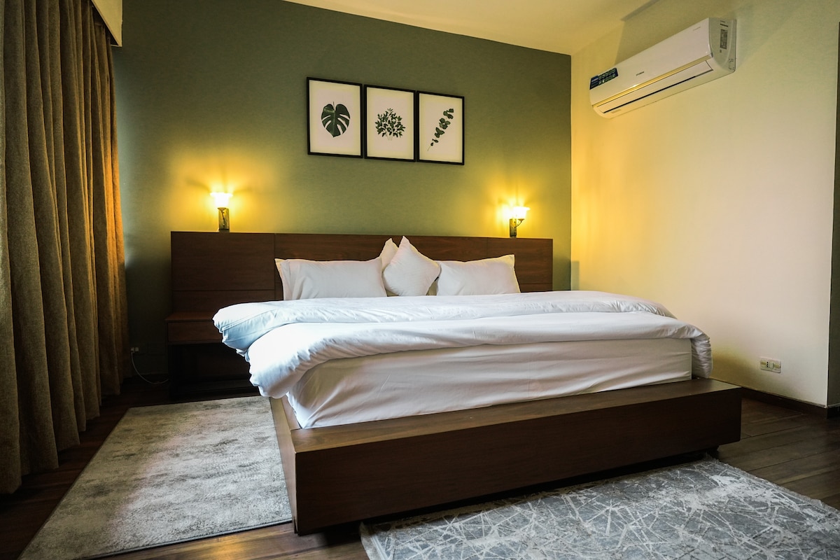 Насолоджуйтеся перебуванням у нашій найзатишнішій квартирі для сімейного відпочинку з однією спальнею. Розташоване в Гульберзі , в центрі міста. Цілодобовий резервний генератор. Спокійна атмосфера. Бензиновий насос, торговий центр, кафе та кінотеатр у пішій доступності. До послуг гостей величезний лаундж, ліжко розміру King size, один додатковий матрац, кухонний блок, обідній стіл, холодильник, духовка, пральна/сушильна машина, тепла вода, телевізор та Інтернет. Це місце призначене для вашого спокою та комфорту.