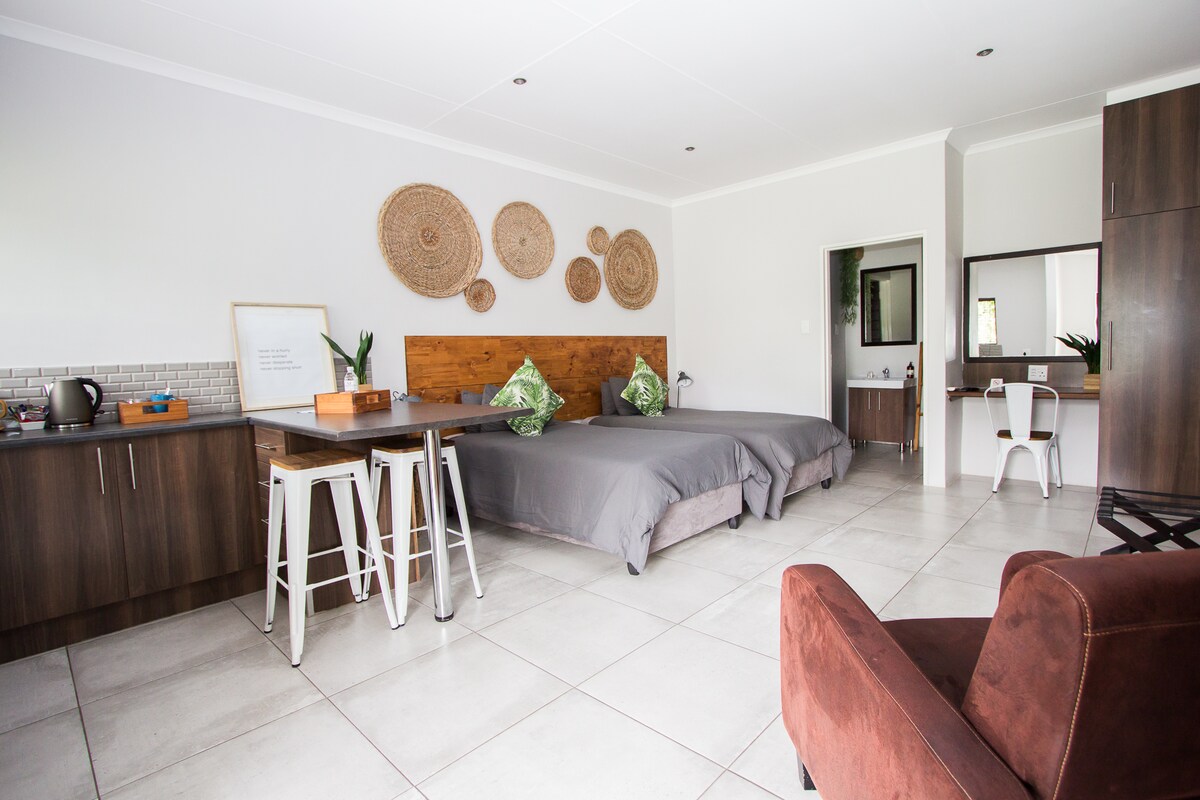 Сучасний приватний люкс з власною ванною кімнатою, джакузі та спільною зоною Braai. Квартира повністю обладнана міні-кухнею, кондиціонером, безкоштовним Wi-Fi та DSTV . Безпечна парковка під кришкою на території, де можна перебувати з дітьми та домашніми тваринами. У Vaal De Vue є ресторан і басейн для гостей. Для гостей доступні веслові човни, каное та рибальські снасті. Кошики для пікніка надаються за запитом для відпочинку на березі Вааля.