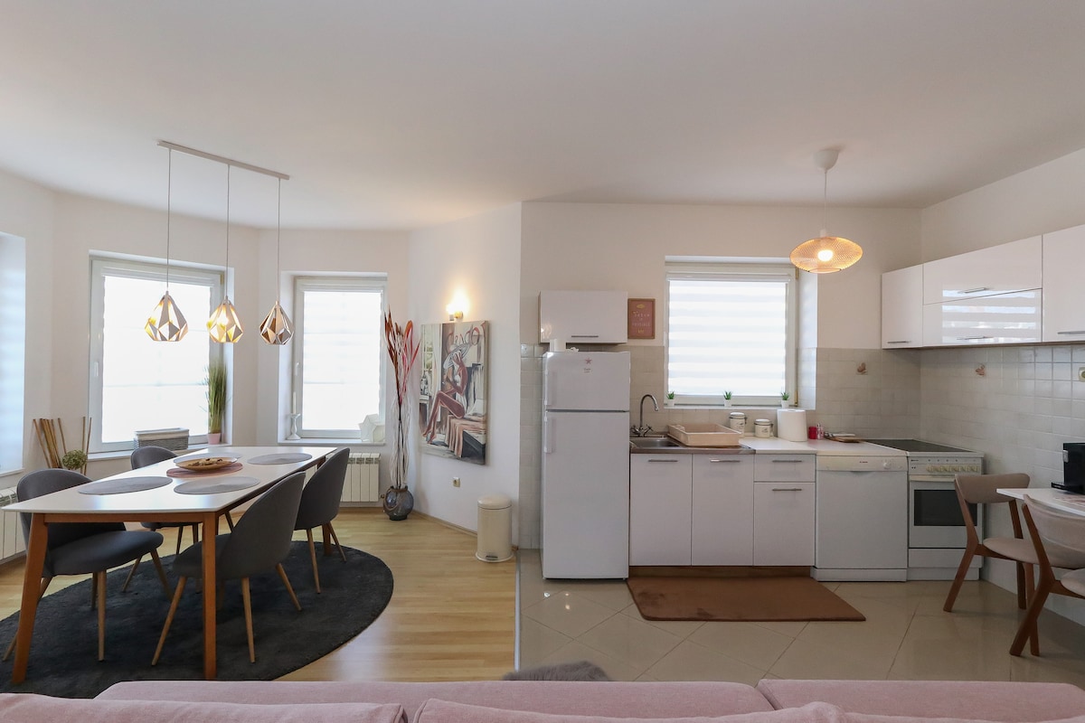 Дизайнерський інтер’єр, оригінальна квартира відкритого плану площею 60 кв. м на одній з найкращих вулиць, Крунській. Квартира розташована на піднятому першому поверсі, з власним паркувальним місцем, а також усіма сучасними зручностями для розкішного перебування. Усе нове. Створено для гостей, які цінують чудове життя. Усі пам’ятки знаходяться поруч, музей Нікола Тесла знаходиться на тій самій вулиці. Через дорогу є іноземне посольство з цілодобовою охороною. Ви не знайдете кращого місця. Пральна машина/сушильна машина. Швидкий Wi-Fi. Насолоджуйтеся!
