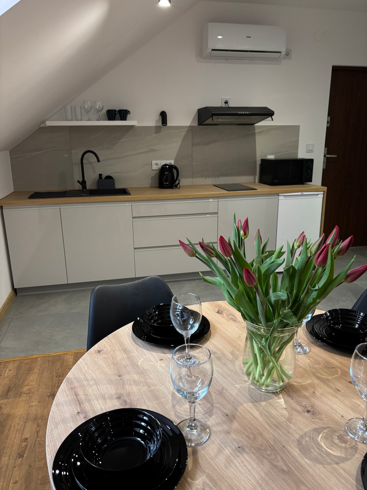 Jabłonkowa Osada - це комплекс для відпочинку, що складається з трьох заміських будинків, повністю з дерева. Квартира ( перший поверх ) до чотирьох осіб, з доступом до сауни, велосипедної кімнати та загальної кімнати з грилем. Красиво оформлені інтер 'єри в оточенні природи Ciśniańsko – Wetliński Landscape Park забезпечать відпочинок навіть найвибагливішим. Оголошення стосується однієї квартири